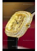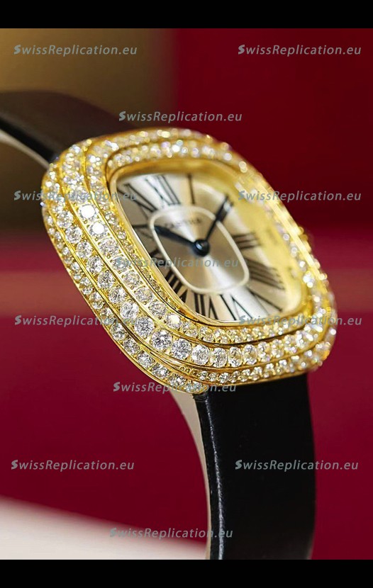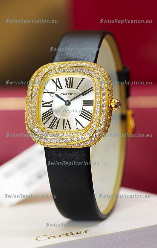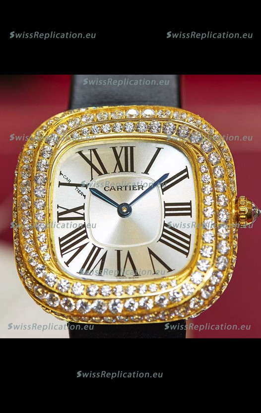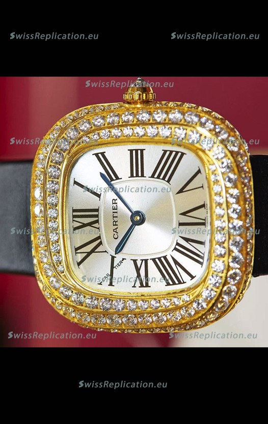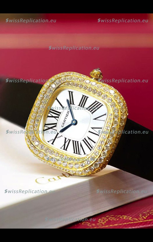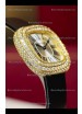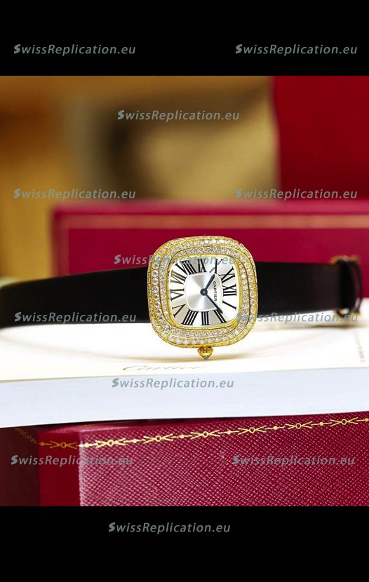 Description Coussin De Cartier Yellow Gold Swiss Replica Watch Black Strap