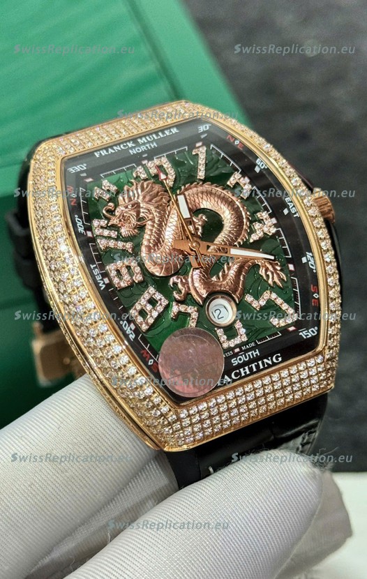 Description Franck Muller Vanguard Yachting Dragon V45 Green Dial in Gold Diamonds Bezel Swiss Replica