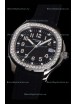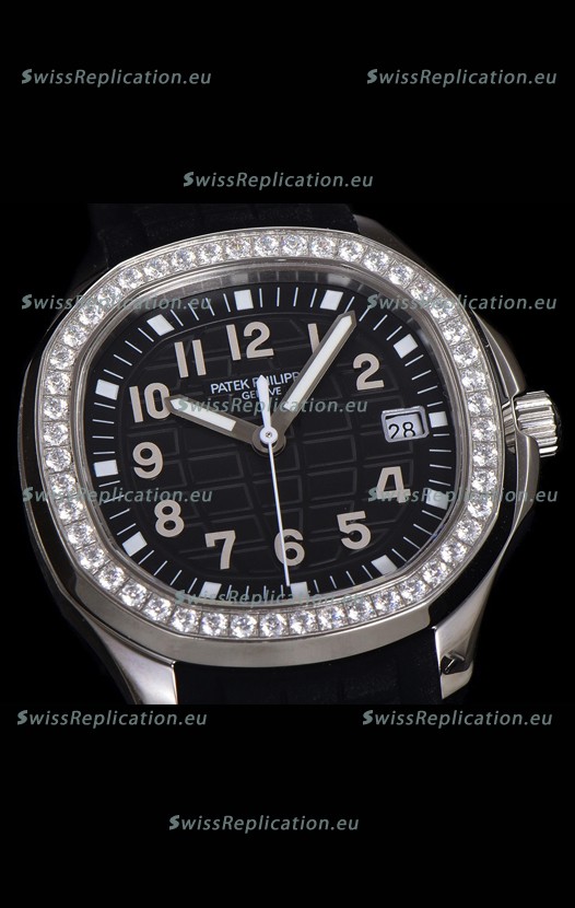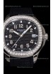 Black Colored Textured Dial with Date Window at 3 O'Clock. Diamonds Bezel