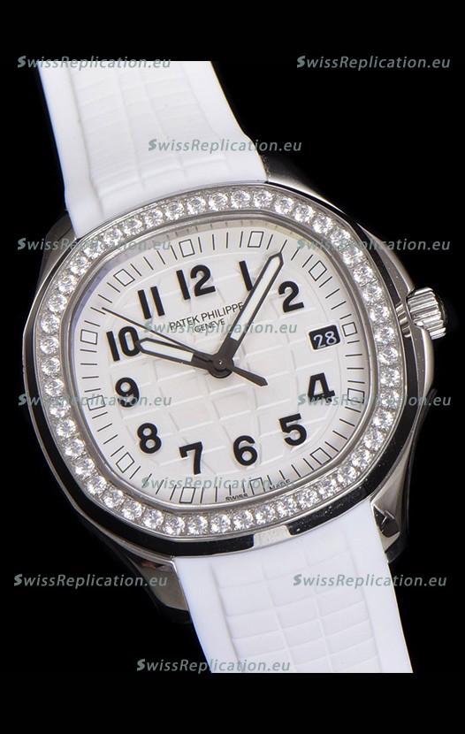 White Colored Textured Dial with Date Window at 3 O'Clock. Diamonds Bezel