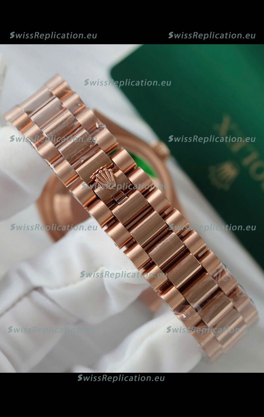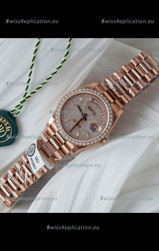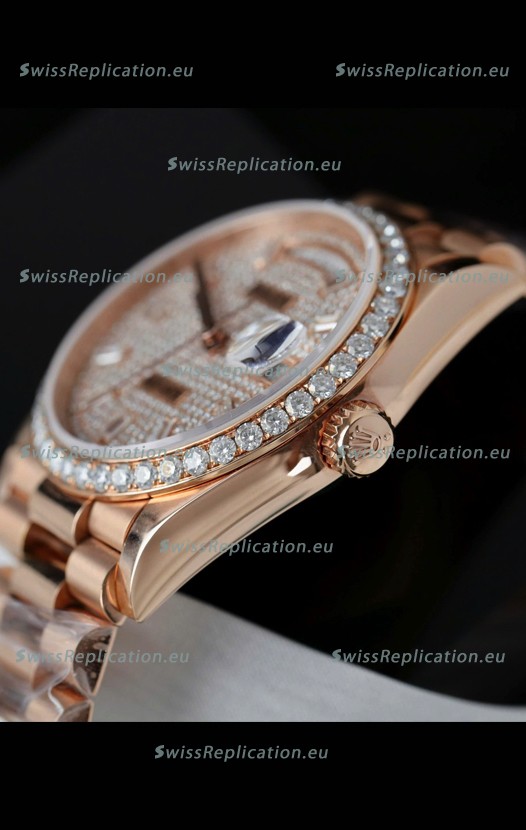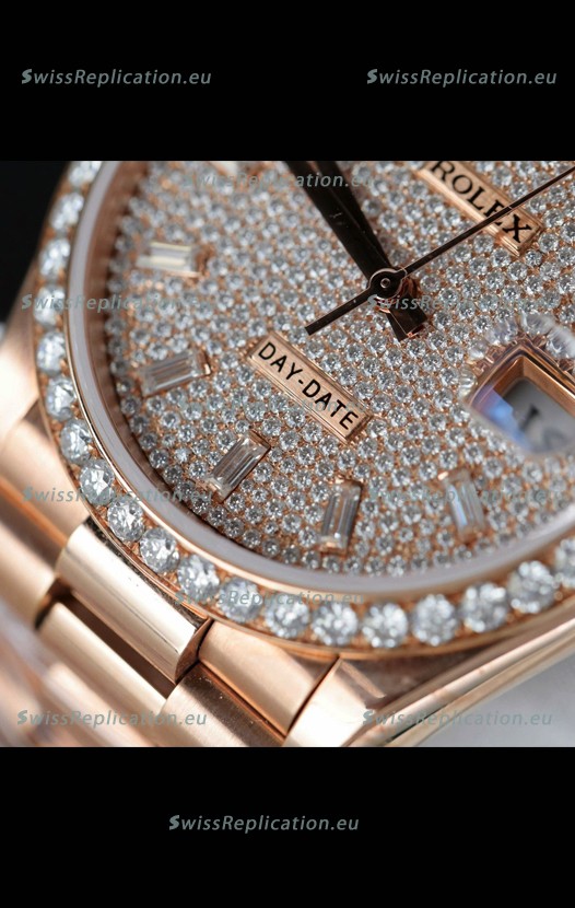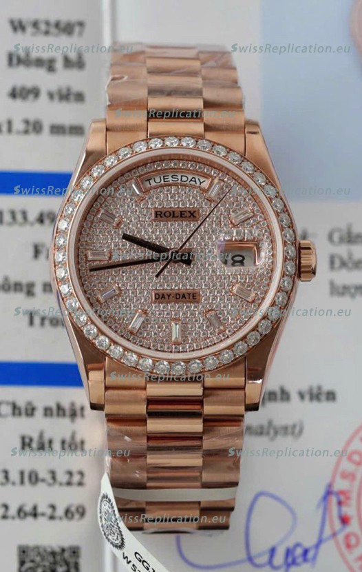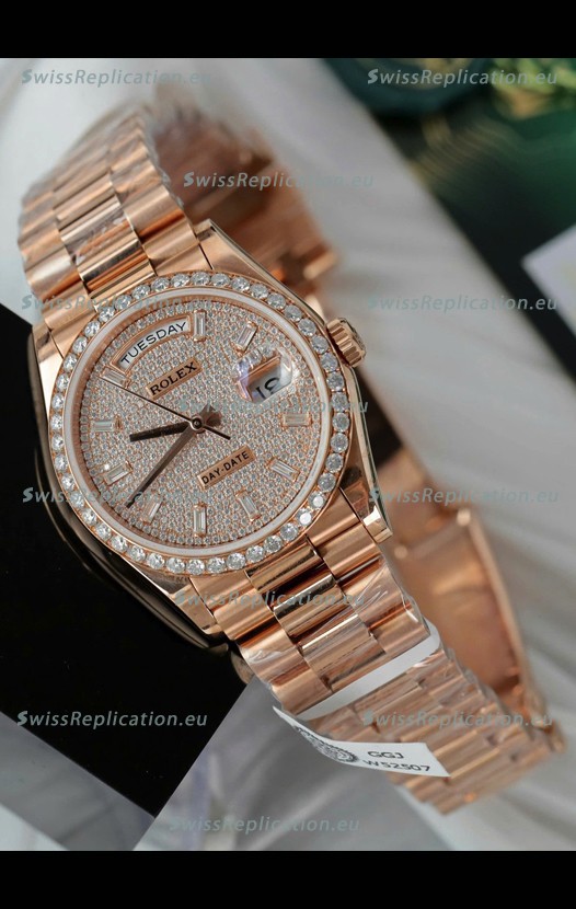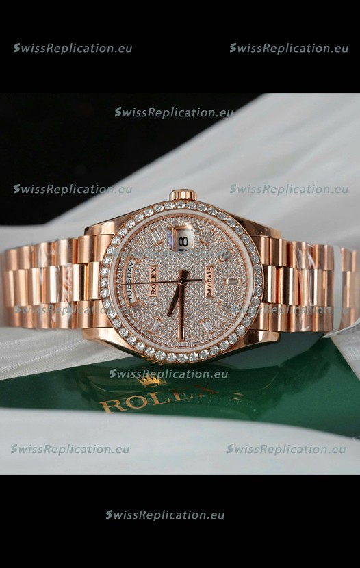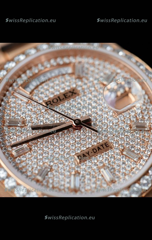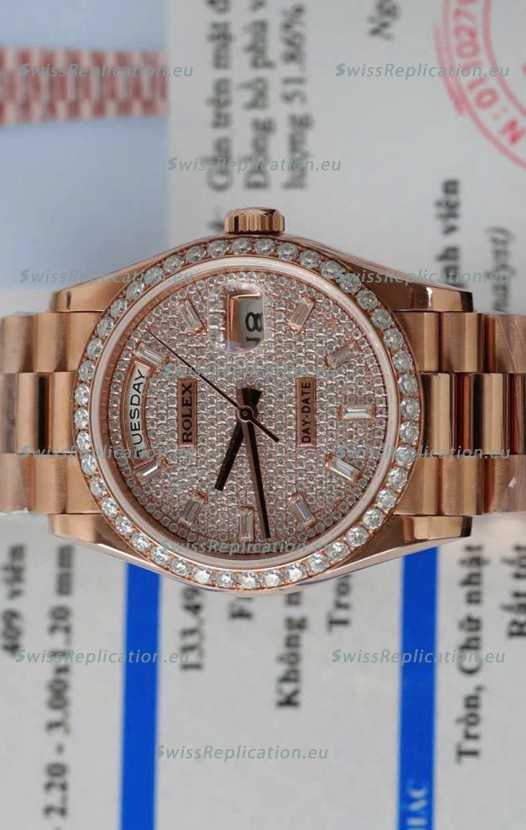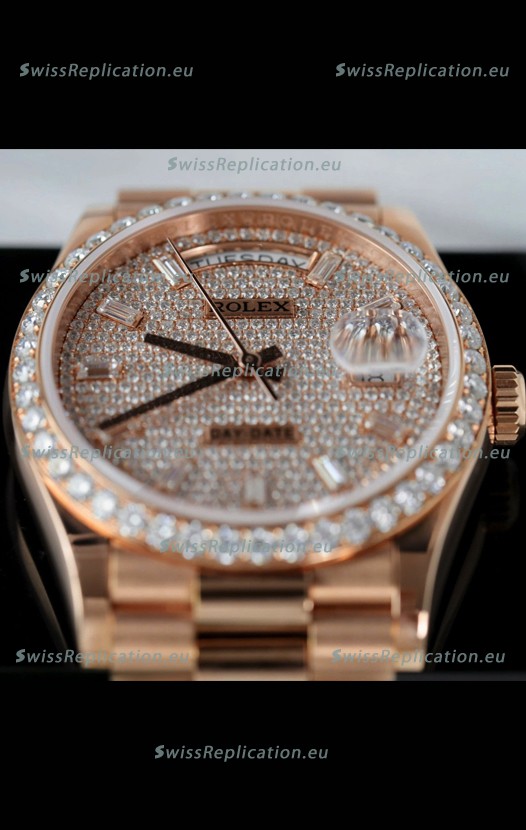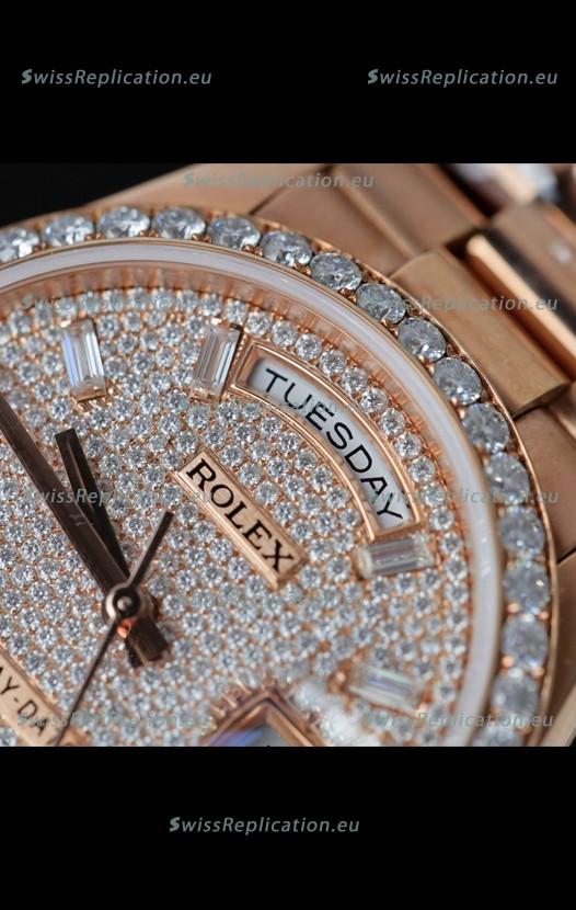 | Description | Rolex Day Date Super Clone Rose Gold Plated Custom Modified Diamonds Paved Watch |