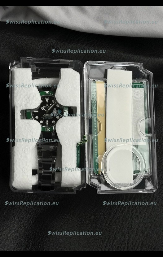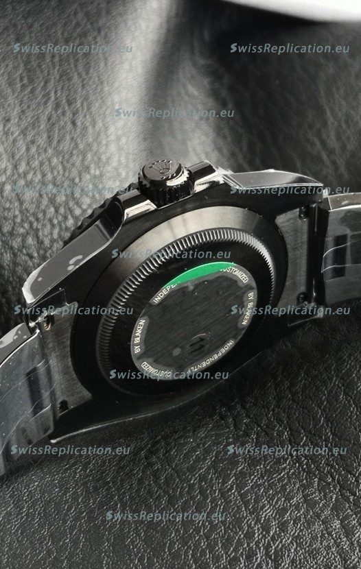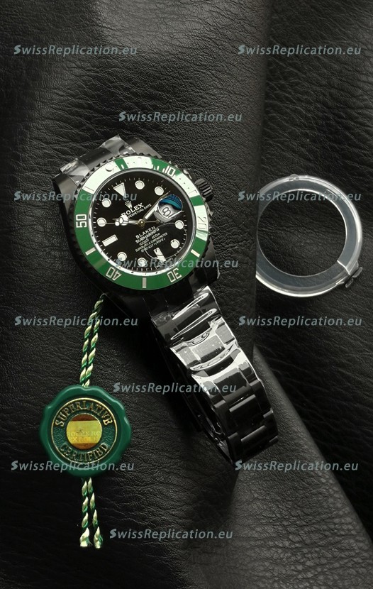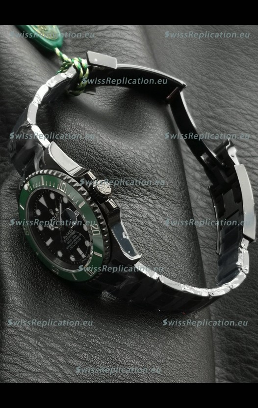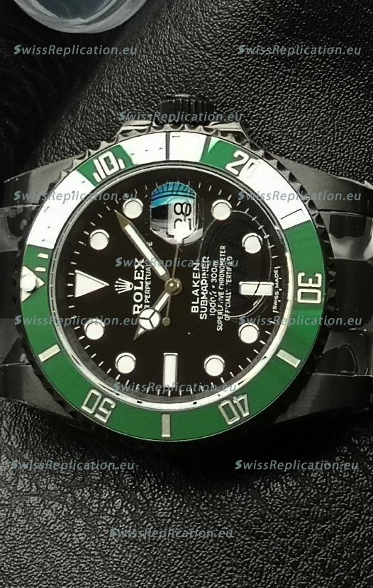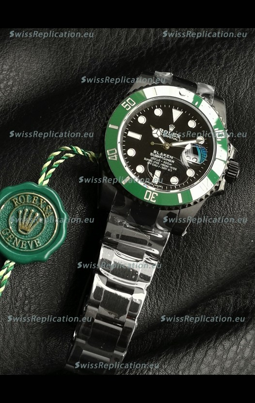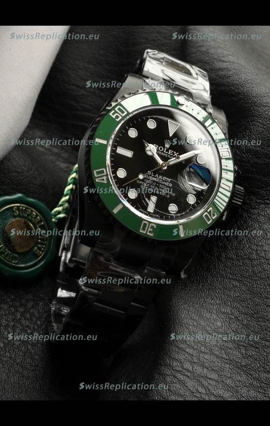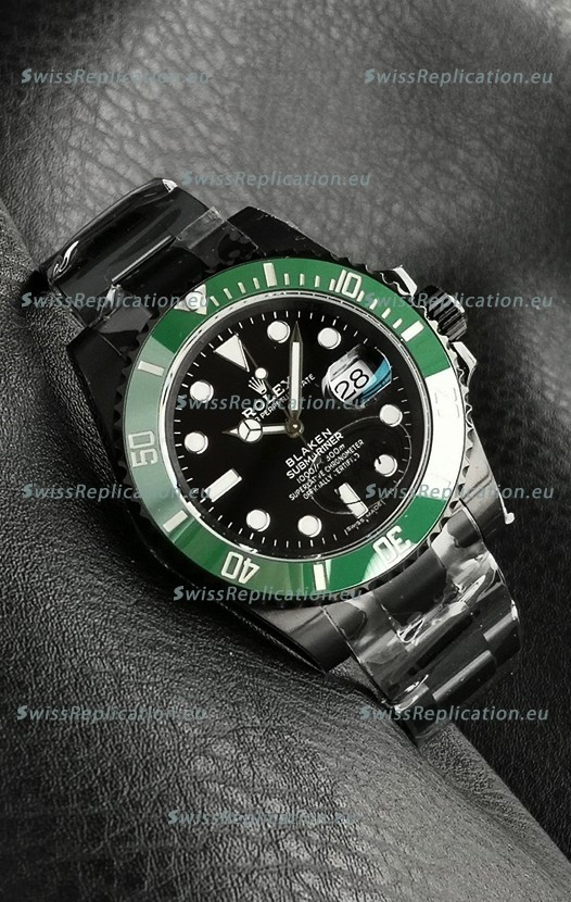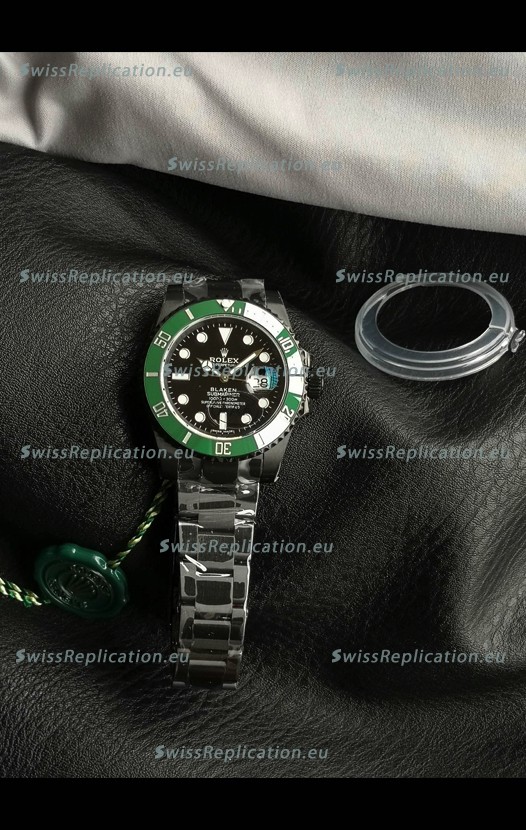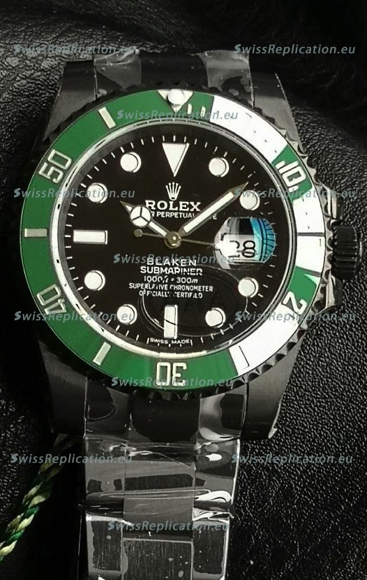 | Description | Rolex Submariner Blaken DLC Coated Swiss Replica Watch in Green Bezel |