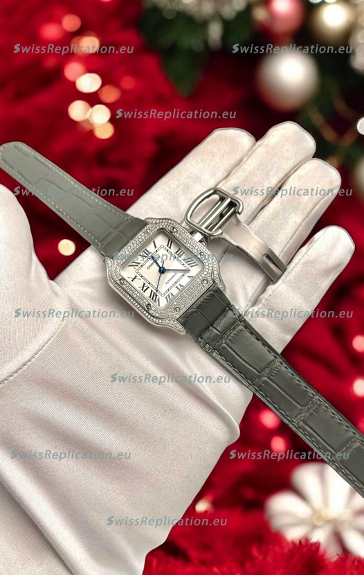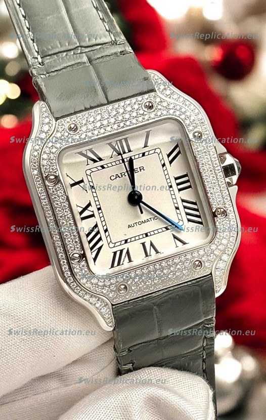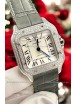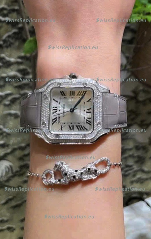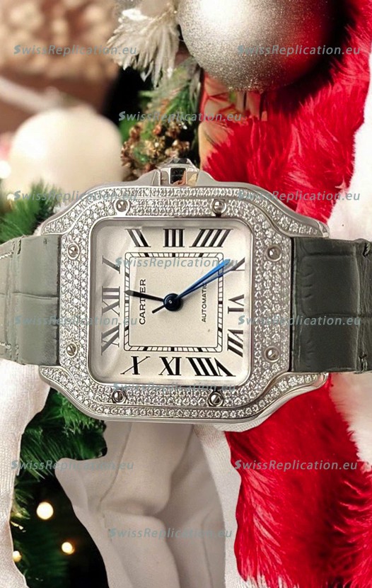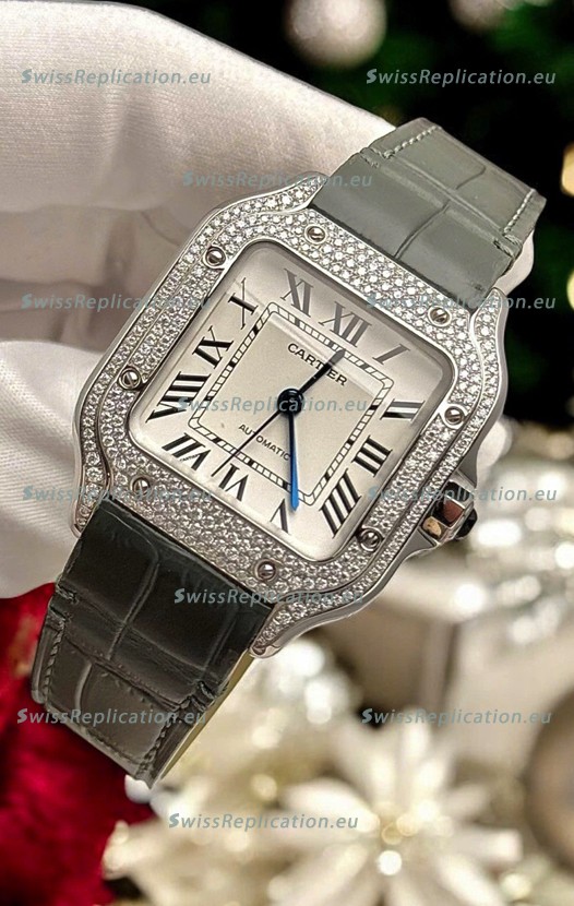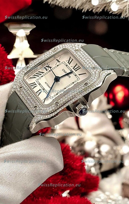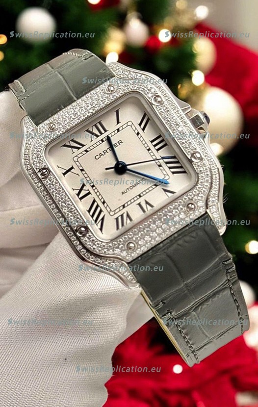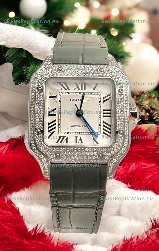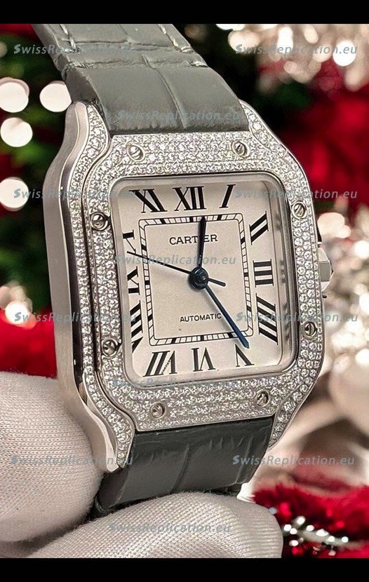 Description Santos De Cartier Watch in White Dial 39.50MM MOSSANITES Paved Bezel Swiss Replica Watch