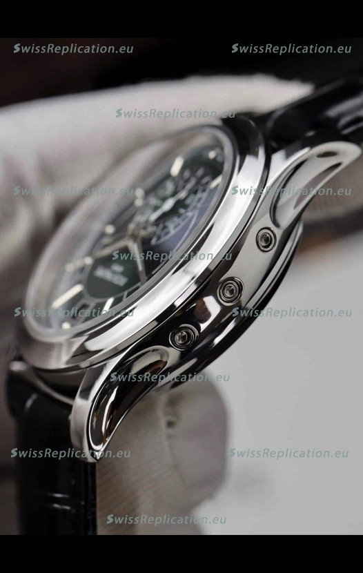 Green Dial with Functional Day/Date and Month Indicator. Moon Phase Indicator functions as 12/24 Hour Counter